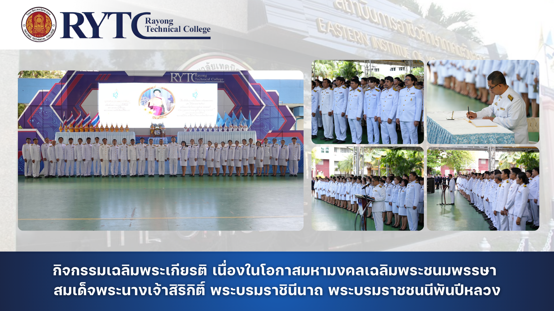 วิทยาลัยเทคนิคระยอง คณะผู้บริหาร ครู บุคลากรทางการศึกษา และนักเรียน นักศึกษา ได้ร่วมกิจกรรมเฉลิมพระเกียรติ เนื่องในโอกาสมหามงคลเฉลิมพระชนมพรรษา สมเด็จพระนางเจ้าสิริกิติ์ พระบรมราชินีนาถ พระบรมราชชนนีพันปีหลวง ในวันที่ ๑๒ สิงหาคม ๒๕๖๘ ซึ่งทรงเจริญพระชนมายุครบ ๙๓ พรรษา