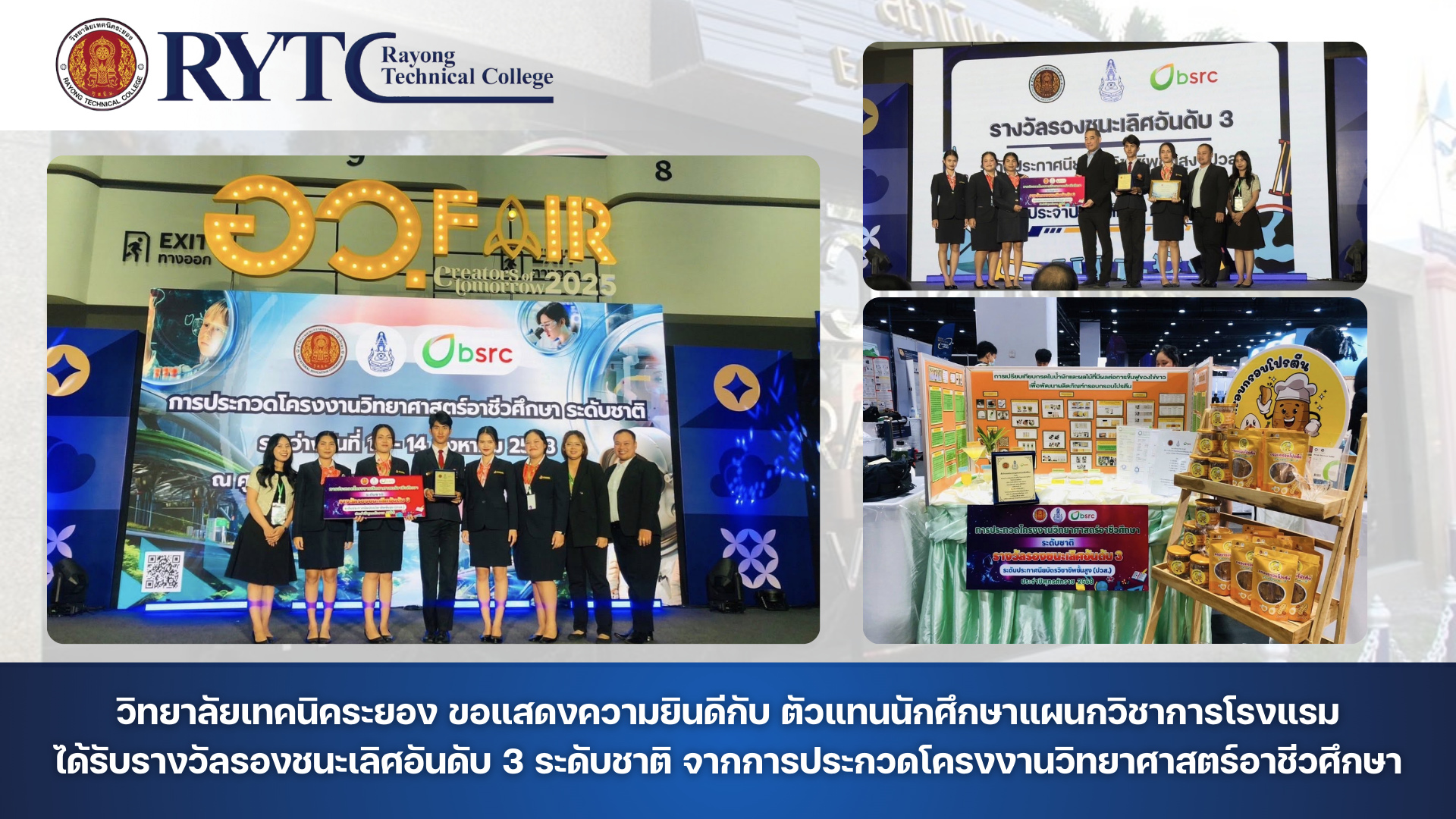 วิทยาลัยเทคนิคระยอง ขอแสดงความยินดีกับ ตัวแทนนักศึกษาแผนกวิชาการโรงแรม ได้รับรางวัลรองชนะเลิศอันดับ 3 ระดับชาติ จากการประกวดโครงงานวิทยาศาสตร์อาชีวศึกษา