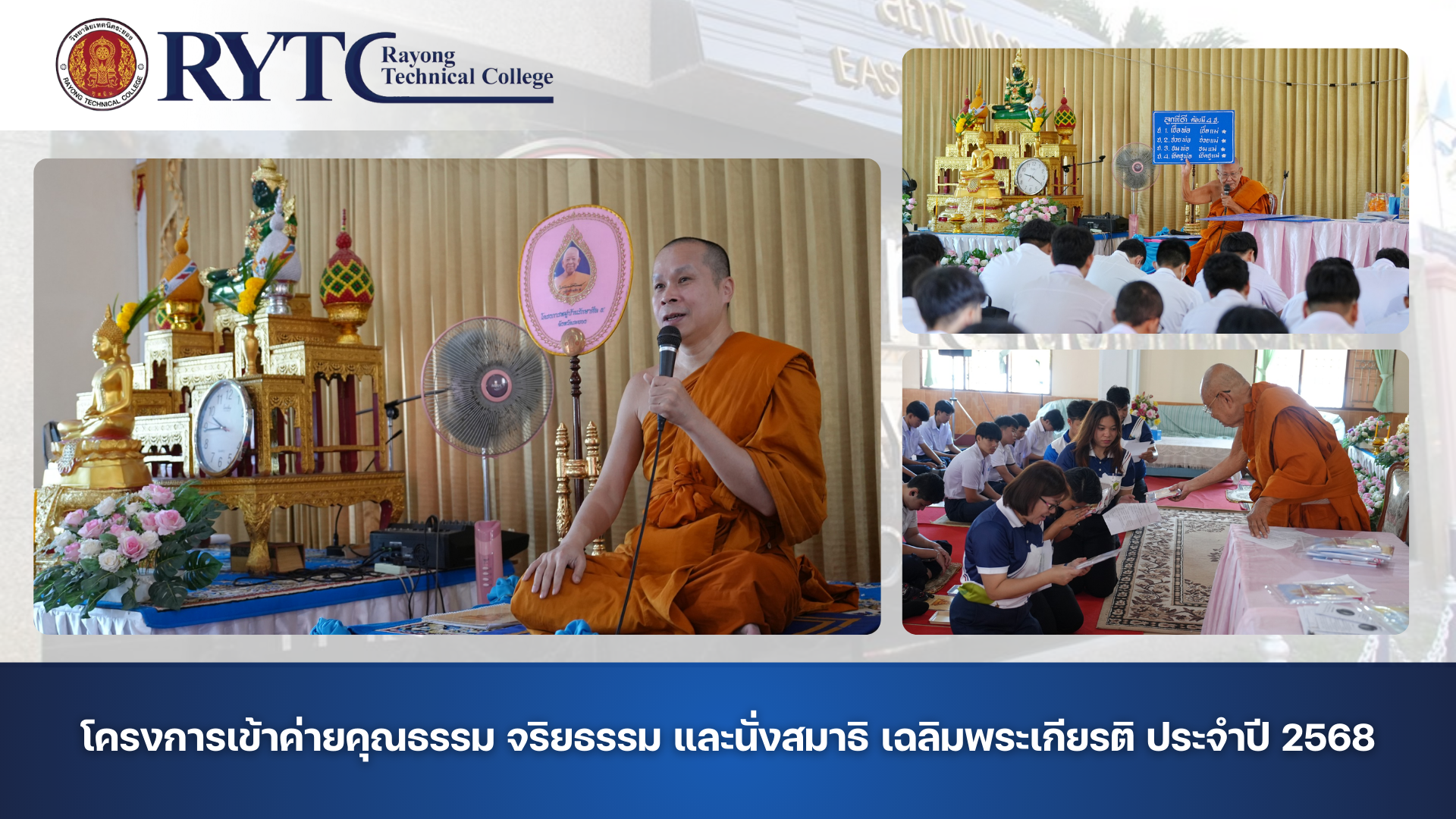 วัดลุ่มมหาชัยชุมพล (พระอารามหลวง) จังหวัดระยอง ได้จัดโครงการเข้าค่ายคุณธรรม จริยธรรม และนั่งสมาธิ เฉลิมพระเกียรติ ประจำปี 2568 โดยมีคณะครู นักเรียน และนักศึกษา วิทยาลัยเทคนิคระยอง เข้าร่วมกิจกรรมในครั้งนี้อย่างพร้อมเพรียง ณ วัดลุ่มมหาชัยชุมพล (พระอารามหลวง) จังหวัดระยอง