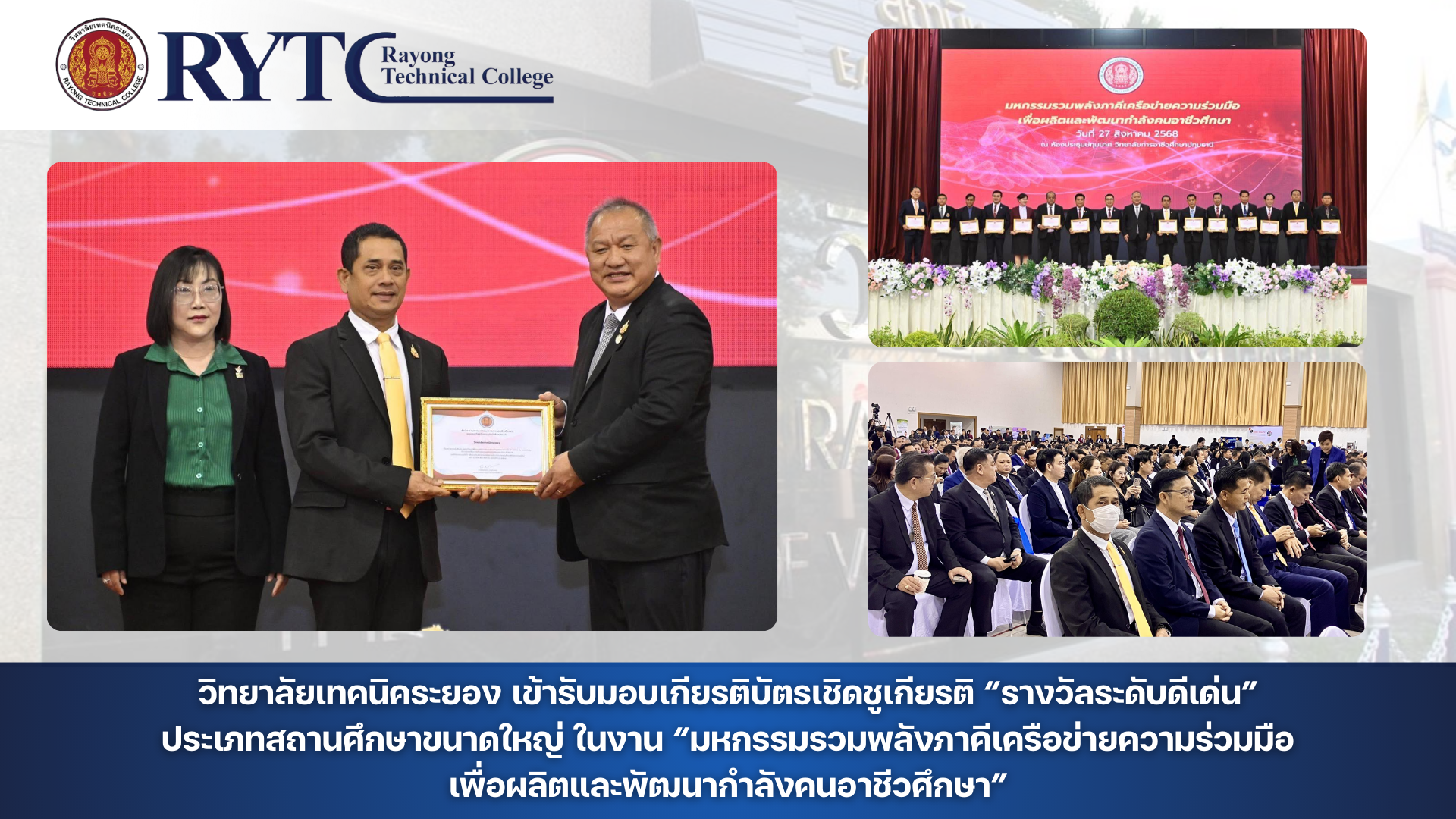 วิทยาลัยเทคนิคระยอง เข้ารับมอบเกียรติบัตรเชิดชูเกียรติ “รางวัลระดับดีเด่น” ประเภทสถานศึกษาขนาดใหญ่ ในงาน “มหกรรมรวมพลังภาคีเครือข่ายความร่วมมือ เพื่อผลิตและพัฒนากำลังคนอาชีวศึกษา”