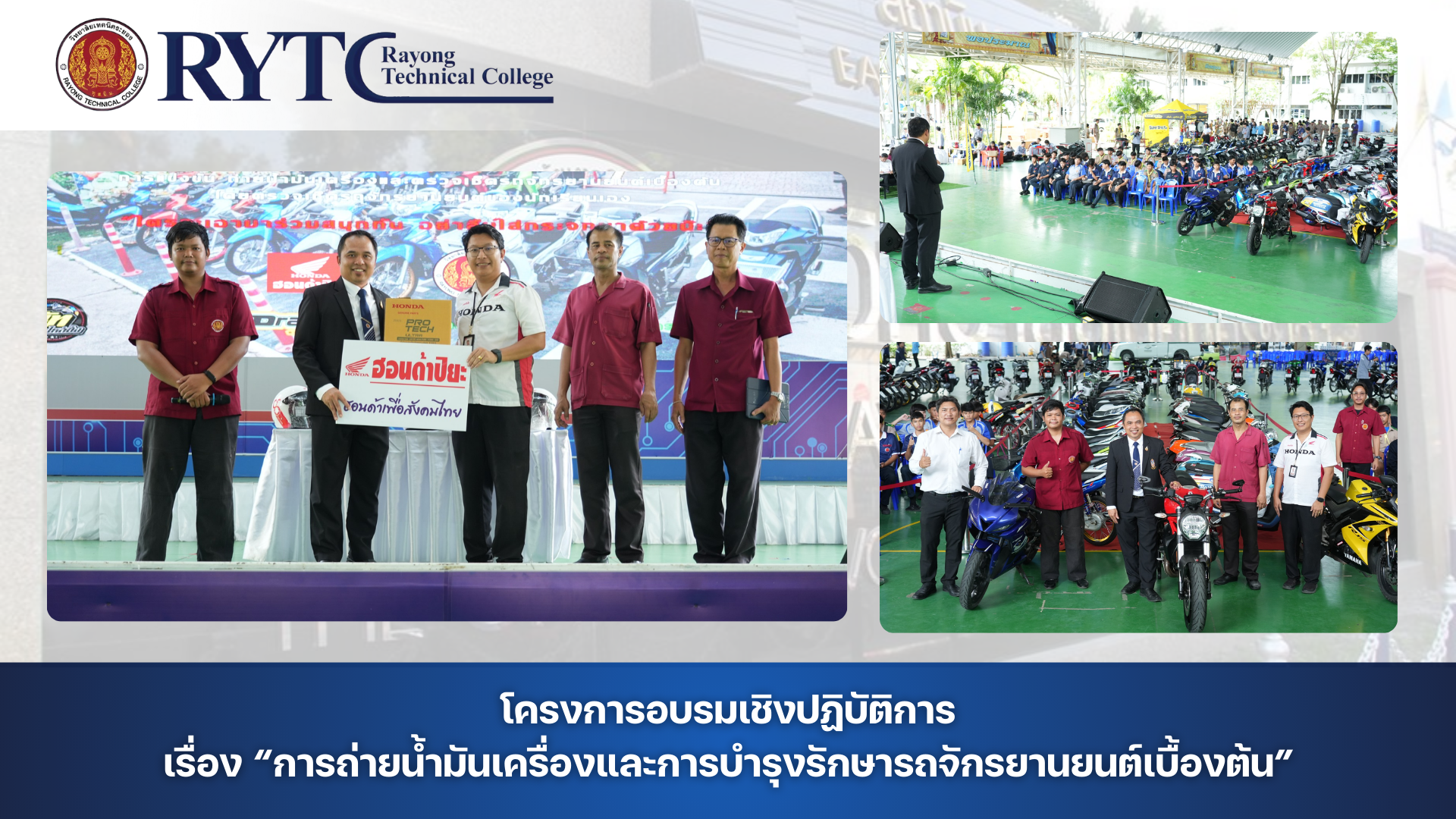 เมื่อวันพุธที่ 27 สิงหาคม 2568 องค์การนักวิชาชีพในอนาคตแห่งประเทศไทย (อวท.) วิทยาลัยเทคนิคระยอง ได้จัดโครงการอบรมเชิงปฏิบัติการเรื่อง “การถ่ายน้ำมันเครื่องและการบำรุงรักษารถจักรยานยนต์เบื้องต้น” โดยมีวัตถุประสงค์เพื่อเสริมสร้างความรู้และทักษะให้นักเรียน นักศึกษา สามารถดูแลและบำรุงรักษารถจักรยานยนต์ได้อย่างถูกต้อง รวมถึงการฝึกปฏิบัติในการตรวจเช็กและประเมินสภาพความพร้อมในการใช้งานของรถจักรยานยนต์