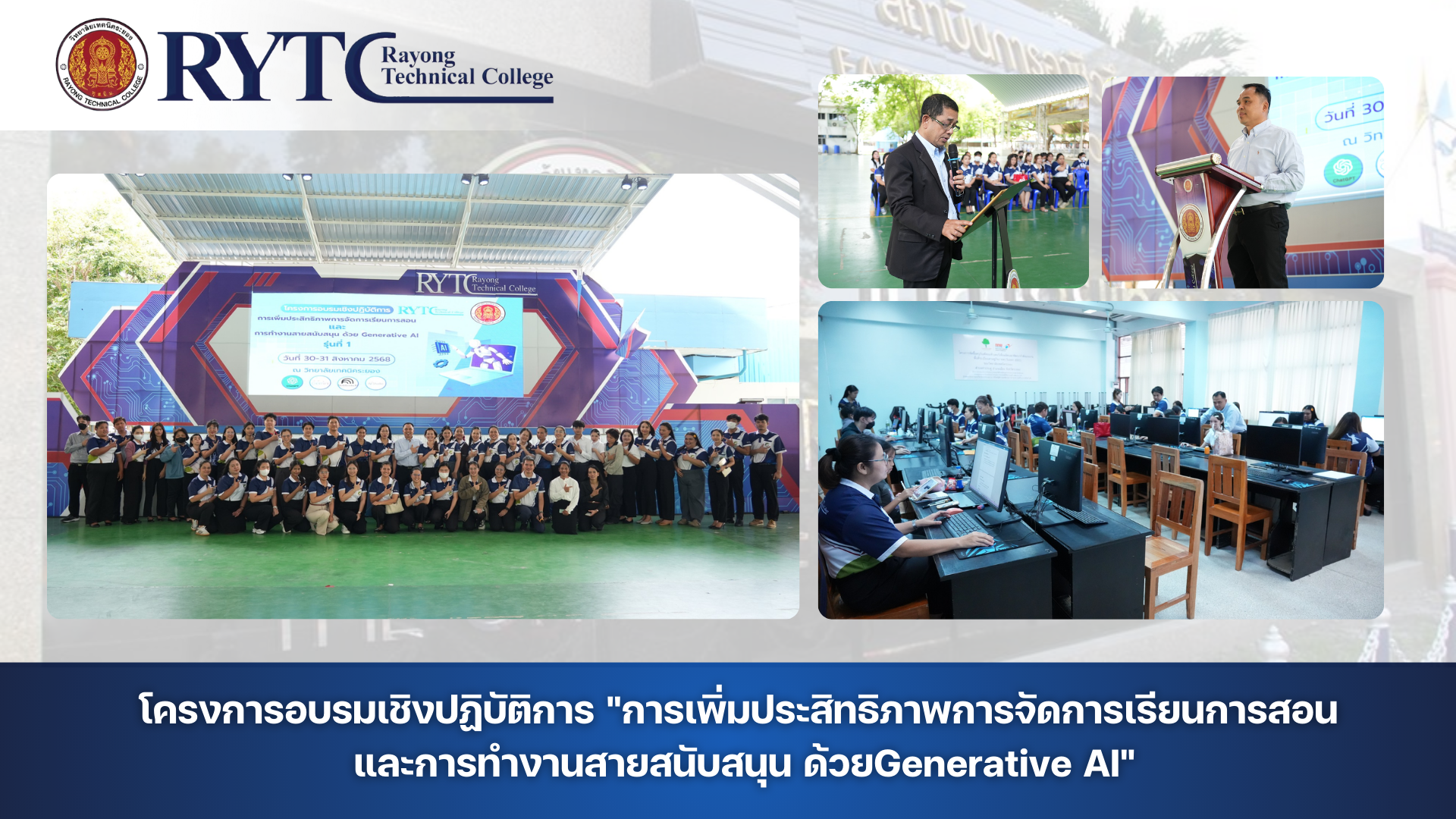 เมื่อวันที่ 30 สิงหาคม 2568 วิทยาลัยเทคนิคระยองได้จัดโครงการอบรมเชิงปฏิบัติการ “การเพิ่มประสิทธิภาพการจัดการเรียนการสอน และการทำงานสายสนับสนุน ด้วย Generative AI” สำหรับบุคลากรทางการศึกษา