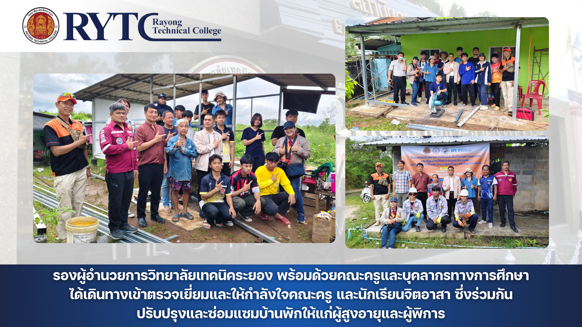 รองผู้อำนวยการวิทยาลัยเทคนิคระยอง พร้อมด้วยคณะครูและบุคลากรทางการศึกษา ได้เดินทางเข้าตรวจเยี่ยมและให้กำลังใจคณะครู และนักเรียนจิตอาสา ซึ่งร่วมกันปรับปรุงและซ่อมแซมบ้านพักให้แก่ผู้สูงอายุและผู้พิการ