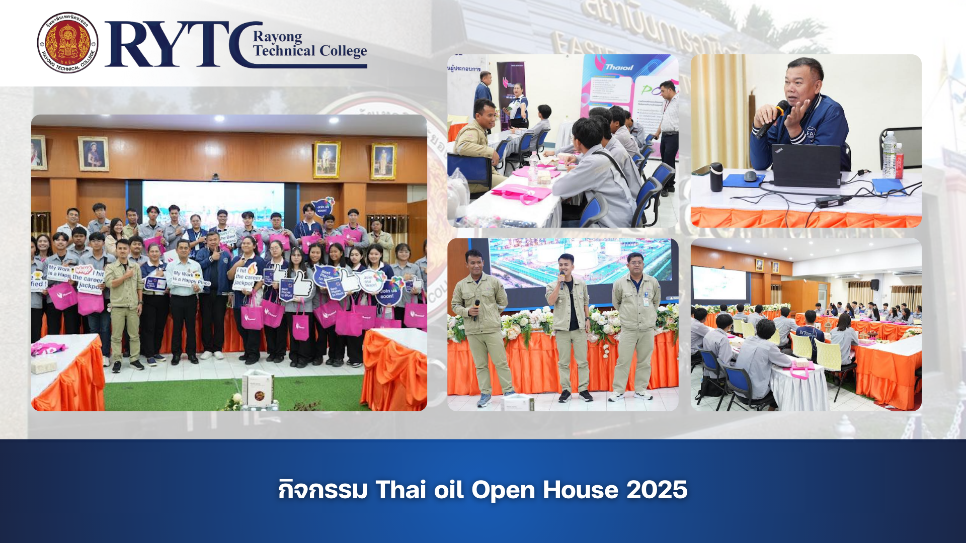 วันเสาร์ที่ 27 กันยายน 2568 เวลา 09.00-11.00 น. บริษัท ไทยออยล์ จำกัด (มหาชน) จัดกิจกรรม Thai oil Open House 2025 สำหรับนักศึกษา ระดับ ปวส.2 ที่สนใจร่วมก้าวสู่การทำงานในโลกพลังงานกับไทยออยล์ โดยมี ดร.ชรินทร์ ชูชื่น รองผู้อำนวยการวิทยาลัยเทคนิคระยอง ให้เกียรติกล่าวต้อนรับทีมงานไทยออยล์และให้โอวาทแก่นักศึกษา ณ ห้องสัมมนาอาชีวศึกษา ชั้น 3 อาคารอำนวยการ วิทยาลัยเทคนิคระยอง