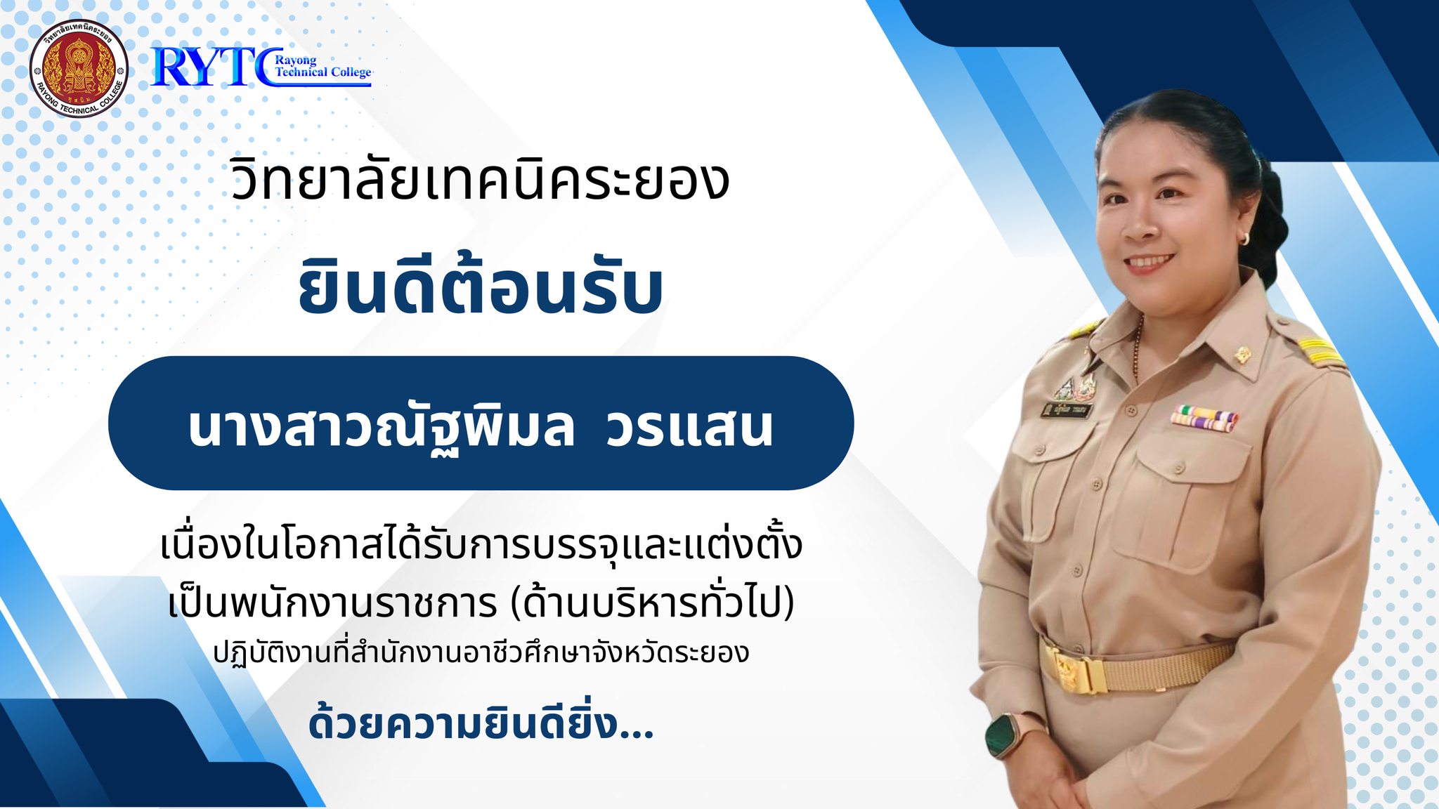 วิทยาลัยเทคนิคระยอง ยินดีต้อนรับ นางสาวณัฐพิมล วรแสน