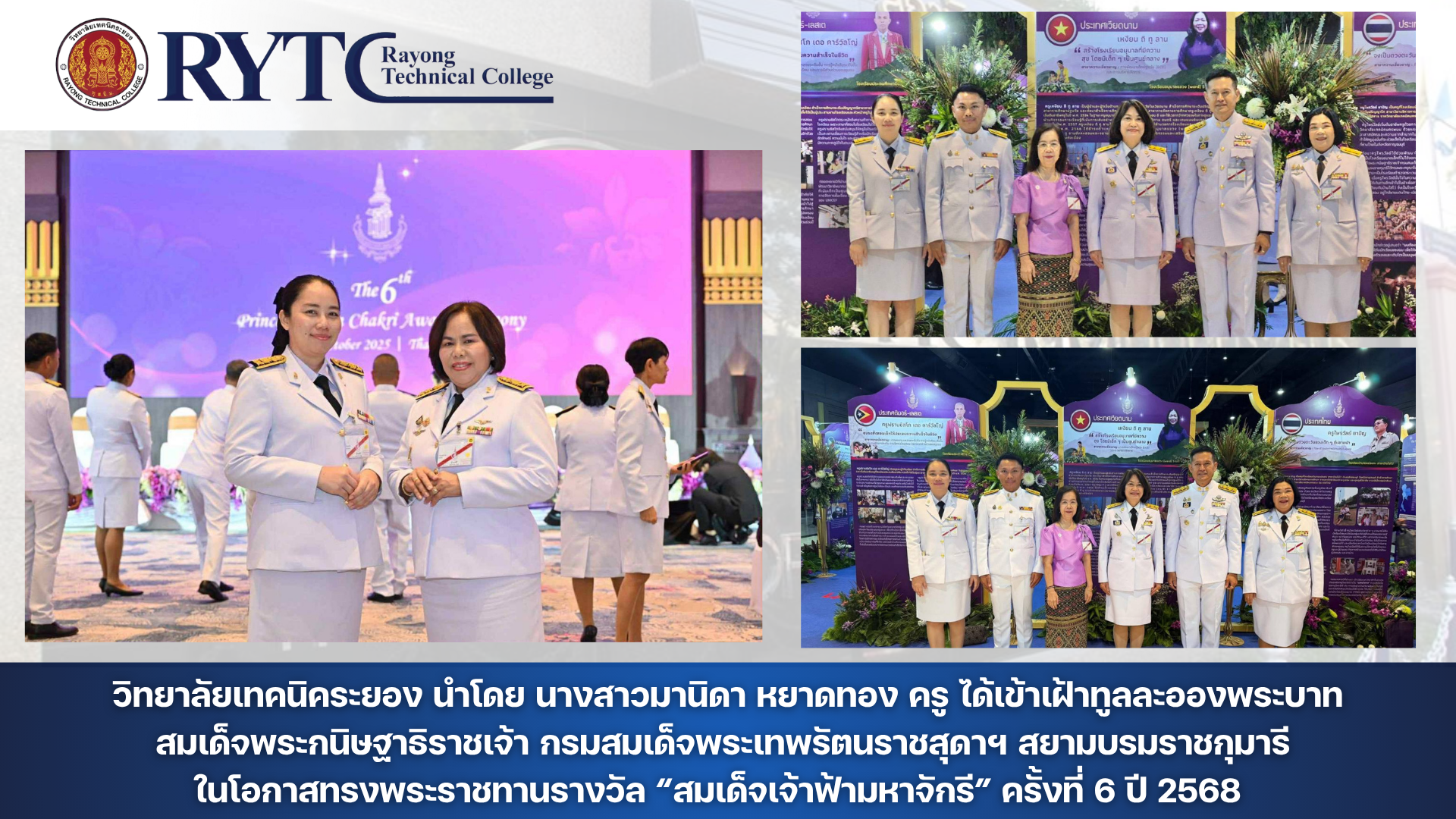 วิทยาลัยเทคนิคระยอง นำโดย นางสาวมานิดา หยาดทอง ครู ได้เข้าเฝ้าทูลละอองพระบาทสมเด็จพระกนิษฐาธิราชเจ้า กรมสมเด็จพระเทพรัตนราชสุดาฯ สยามบรมราชกุมารี ในโอกาสทรงพระราชทานรางวัล “สมเด็จเจ้าฟ้ามหาจักรี” ครั้งที่ 6 ปี 2568 และร่วมฉายพระฉายาลักษณ์กับคณะครูไทยผู้ได้รับรางวัล