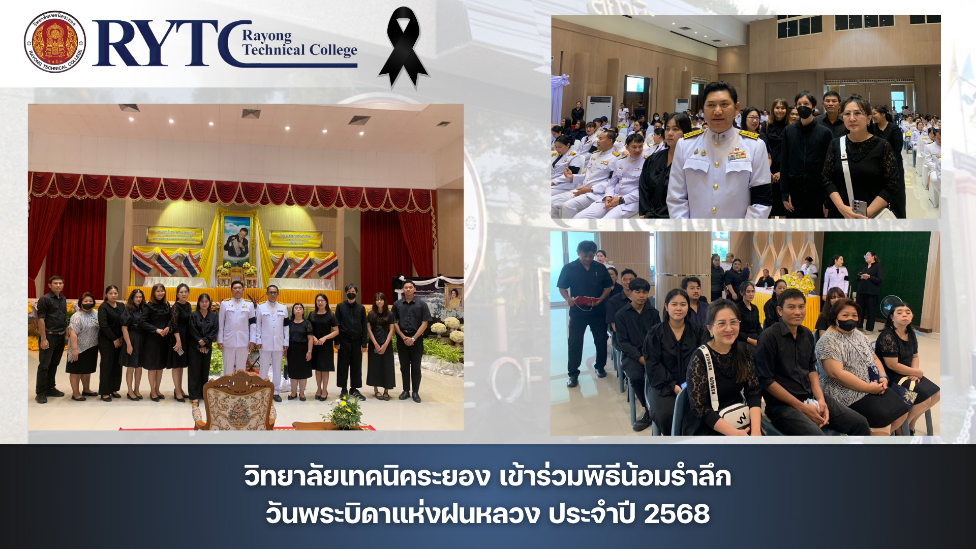 วันศุกร์ที่ ๑๔ พฤศจิกายน ๒๕๖๘ นายชาคริต รุ่งรัตน์ รองผู้อำนวยการฝ่ายวิชาการ พร้อมด้วยคณะครูและบุคลากรทางการศึกษา วิทยาลัยเทคนิคระยอง เข้าร่วมพิธีน้อมรำลึกในพระมหากรุณาธิคุณ พระบาทสมเด็จพระบรมชนกาธิเบศร มหาภูมิพลอดุลยเดชมหาราช บรมนาถบพิตร เนื่องในโอกาส วันพระบิดาแห่งฝนหลวง ประจำปี ๒๕๖๘ ณ หอประชุมใหญ่ ศูนย์ราชการจังหวัดระยอง อำเภอเมืองระยอง จังหวัดระยอง โดยมีหัวหน้าส่วนราชการ ข้าราชการ และประชาชนในจังหวัดระยอง เข้าร่วมพิธี ด้วยความสำนึกในพระมหากรุณาธิคุณอย่างหาที่สุดมิได้