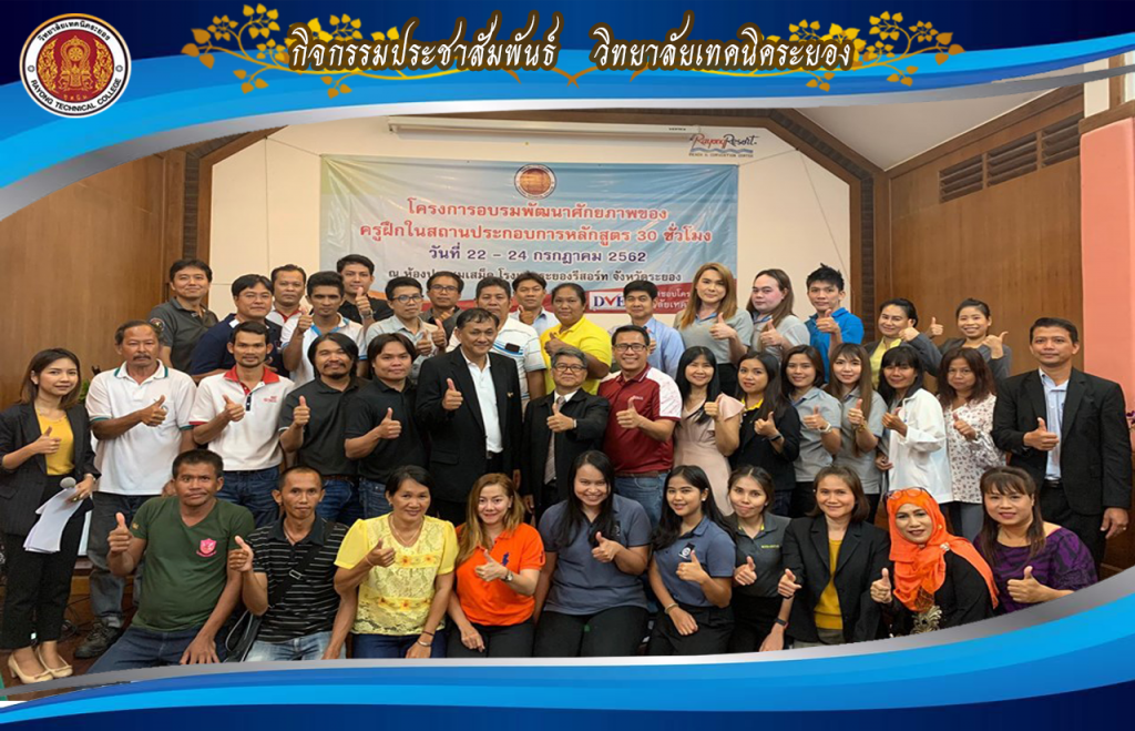 วิทยาลัยเทคนิคระยอง จัดโครงการอบรมพัฒนาศักยภาพของครูฝึกในสถานประกอบการหลักสูตร 30 ชั่วโมง ระหว่างวันที่ 22-24 กรกฎาคม 2562 ณ ห้องประชุมเสม็ด โรงแรมระยองรีสอร์ท จัวหวัดระยอง