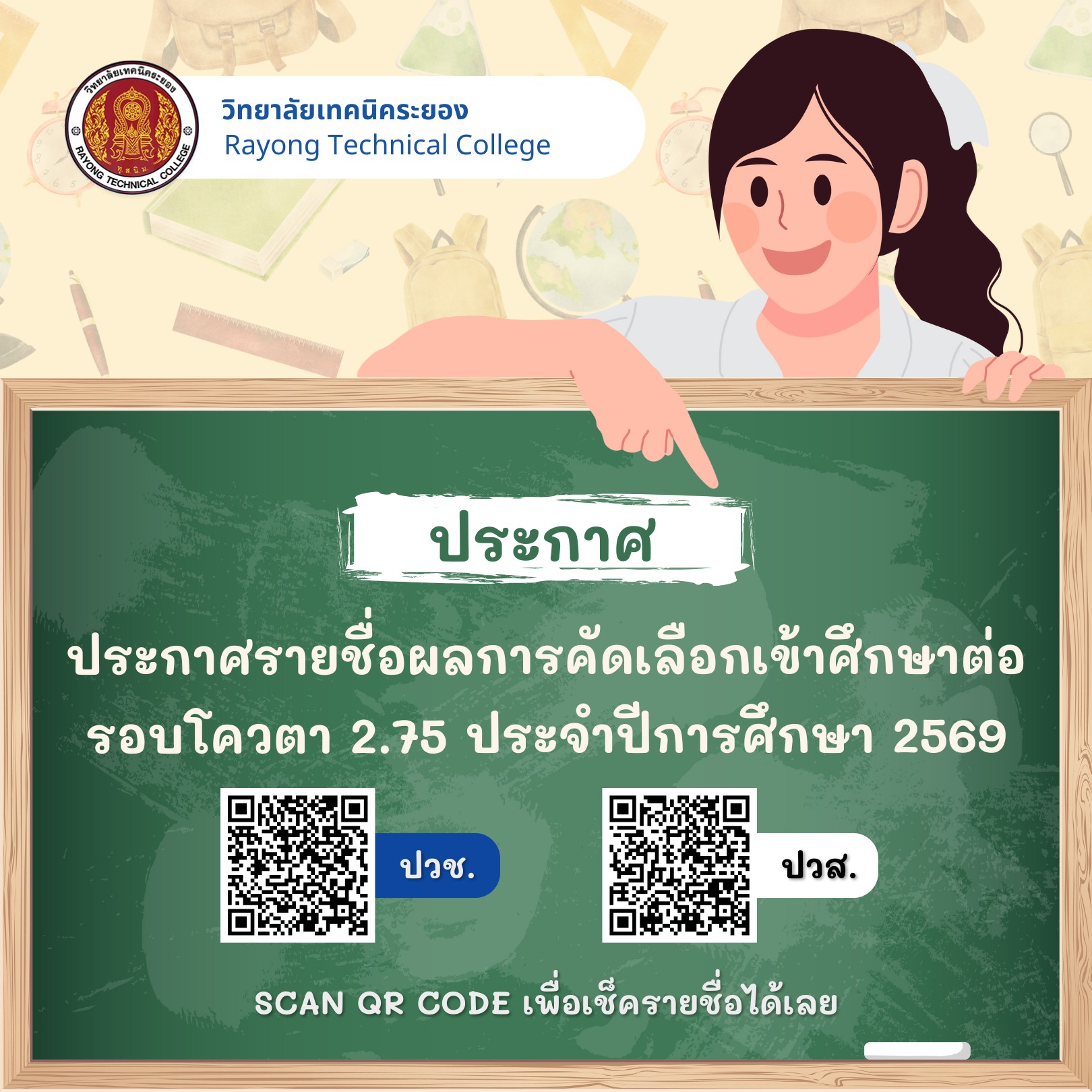 ประกาศรายชื่อผู้ผ่านการคัดเลือกเข้าศึกษาต่อ รอบโควตา 2.75 ประจำปีการศึกษา 2569