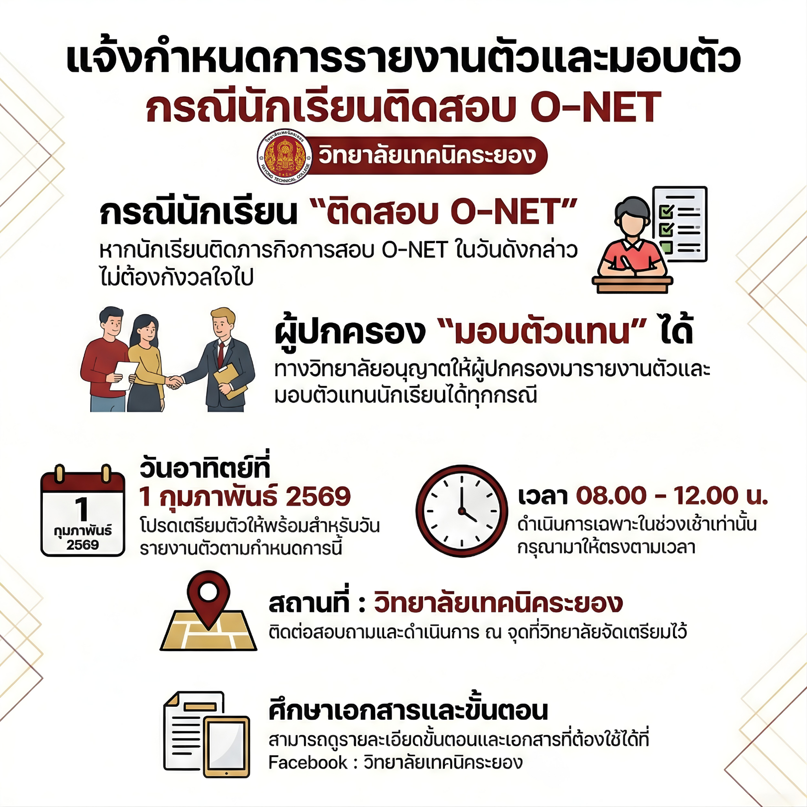 แจ้งกำหนดการลงทะเบียน และมอบตัวในกรณีนักศึกษาติดสอบ O-NET